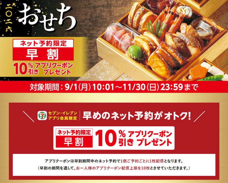 feed 商品について 【おせち】ネット予約限定早割について 更新日 2025年10月20日 ネット予約限定早割のご利用方法についてはこちら。早割対象おせち一覧はリンク先の中段に記載がございます。 ※7idの確認方法についてはこちら。 このFAQは役に立ちましたか? はい いいえ ご意見・ご感想をお寄せくださいお問い合わせを入力されましてもご返信はいたしかねます ご意見・ご感想 商品について くじ・キャラクター商品 予約商品について 商品について ホットスナックについて 店舗でのお取り扱いについて セブンカフェ 年賀状印刷 その他 TOPへ戻る