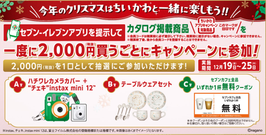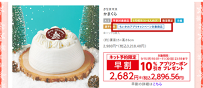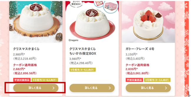 feed 商品について 【クリスマスケーキ】セブン‐イレブンアプリちいかわキャンペーンの対象商品が知りたい 更新日 2025年10月20日 対象商品につきましては、ホームページでご案内をしております。詳細はこちら。 step.1クリック・タップ後、 ページ中段「カテゴリ一覧」→「オリジナルケーキ」を押す。 step.2「詳しく見る」を押す。 step.3赤枠の部分に、対象商品について記載がございます。 ちいかわキャンペーンについての詳細はこちら。 このFAQは役に立ちましたか? はい いいえ ご意見・ご感想をお寄せくださいお問い合わせを入力されましてもご返信はいたしかねます ご意見・ご感想 商品について くじ・キャラクター商品 予約商品について 商品について ホットスナックについて 店舗でのお取り扱いについて セブンカフェ 年賀状印刷 その他 TOPへ戻る