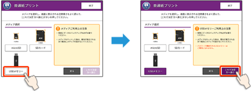 ③メディア選択画面で[USBメモリー]を選択し、[これで決定 次へ進む]を押してください。