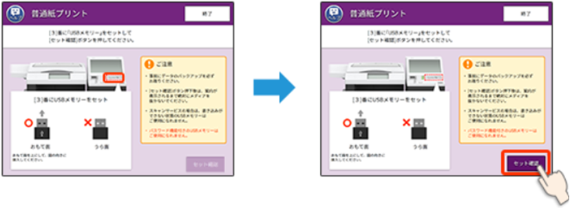 ④USBメモリーをセットし、[セット確認]を押してください。