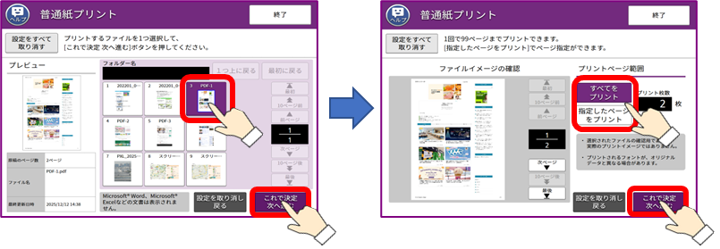 ⑥ プリントしたいファイルを選択して[これで決定 次へ進む]を押します。