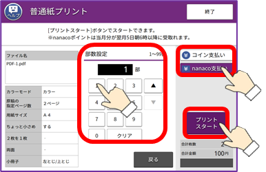 ⑨ 部数を入力し、支払い方法を選んで、[プリントスタート]を押します。
