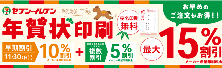 feed 商品について 【年賀状】印刷について 更新日 2025年10月8日 ご利用いただきありがとうございます。年賀状印刷についての詳細はこちら。 お申込みについて、よくいただくご質問は【ご利用ガイド】にまとめてご案内しております。ご不明な点やご心配なことがございましたら、ご利用ガイドの下段をご確認ください。※年賀状印刷の問合せ先についてはこちら。 このFAQは役に立ちましたか? はい いいえ ご意見・ご感想をお寄せくださいお問い合わせを入力されましてもご返信はいたしかねます ご意見・ご感想 商品について くじ・キャラクター商品 予約商品について 商品について ホットスナックについて 店舗でのお取り扱いについて セブンカフェ 年賀状印刷 その他 TOPへ戻る