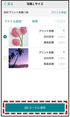 ③ 印刷するデータを選択後、画面下の【QRコードに保存】ボタンを押します。