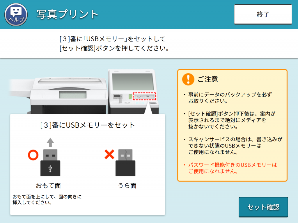 マルチコピー機のタッチパネルで「プリント」→「写真プリント」を選択します。