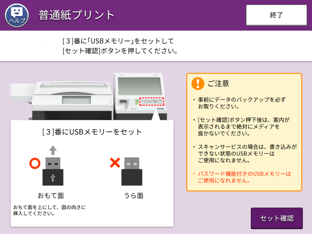 マルチコピー機のタッチパネルで「プリント」→「普通紙プリント」を選択します。